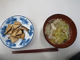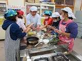 次に、各班に分かれ自分たちの立てた献立表に基づき、味噌汁、シイタケのバターいためなどを調理しました。