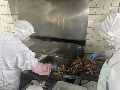 今日の主菜は、「ちくわのごま揚げ」です。ちくわを1/4にカットすることから始まります。200本以上のちくわをカットするのは大変な作業ですが、ちくわの揚げ物は子供たちに人気なので調理員さんはがんばって作業してくれています。
