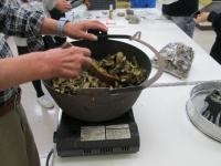 おもてなしのための、ご馳走は、山や田でとれた、さといも、きのこ、たいこん、にんじん、豆などと使って料理します。魚は本来尾頭付きを使いますが、給食では、地元のふくらぎを使いました。