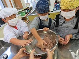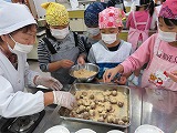 おもてなしのための、ご馳走は、山や田でとれた、さといも、きのこ、たいこん、にんじん、豆などと使って料理します。魚は本来尾頭付きを使いますが、給食では、地元のふくらぎを使いました。