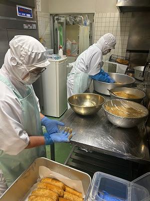 今日は久しぶりの「きなこ揚げパン」です。穴水町は冷凍のパンを使用しているので、袋から出すことから始ま枝ります。350個のパンをあけ、油で揚げて、きなこをまぶします。手間のかかる作業ですが、子どもたちの好きなメニューなので調理員さんたちはがんばってくれました(^▽^)