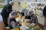 おもてなしのための、ご馳走は、山や田でとれた、さといも、きのこ、たいこん、にんじん、豆などと使って料理します。魚は本来尾頭付きを使いますが、給食では、地元のふくらぎを使いました。