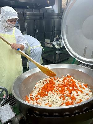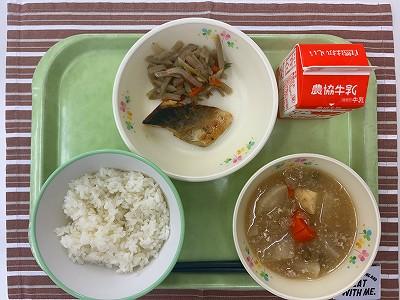 汁物は。「だいこんのそぼろ煮」です。ひき肉は、とりとぶたを合わせてあります。具だくさんでとろみもついて、さむい時期にぴったりですね!