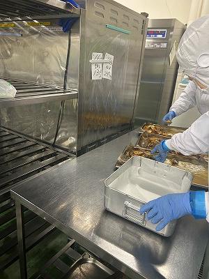 今日の主菜は、「さばのねぎみそ焼き」です。調理場でさばを調味料に漬け込んで、スチームコンベクションオーブンで焼きました。おいしそうな香りといい焼目がつきました!