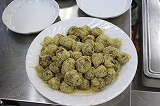 おもてなしのための、ご馳走は、山や田でとれた、さといも、きのこ、たいこん、にんじん、豆などと使って料理します。魚は本来尾頭付きを使いますが、給食では、地元のふくらぎを使いました。