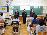 本日、穴水中学生徒会役員の3名が来校し、「穴水中学校でのあいさつの仕方」「学習方法」「学習時間」「宿題や提出物」「部活動」「授業の掟」「学校行事」などとても分かりやすく説明して下さいました。