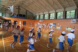 運動場が使えない日は、体育館で練習をします。