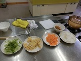 おもてなしのための、ご馳走は、山や田でとれた、さといも、きのこ、たいこん、にんじん、豆などと使って料理します。魚は本来尾頭付きを使いますが、給食では、地元のふくらぎを使いました。