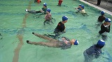 着衣のまま泳ぐ大変さを体感した後、仰向けに浮く方法やペットボトルを使って浮く方法など1年生から6年生まで多くのことを学びました。