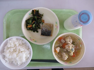おもてなしのための、ご馳走は、山や田でとれた、さといも、きのこ、たいこん、にんじん、豆などと使って料理します。魚は本来尾頭付きを使いますが、給食では、地元のふくらぎを使いました。