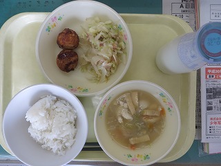 おもてなしのための、ご馳走は、山や田でとれた、さといも、きのこ、たいこん、にんじん、豆などと使って料理します。魚は本来尾頭付きを使いますが、給食では、地元のふくらぎを使いました。