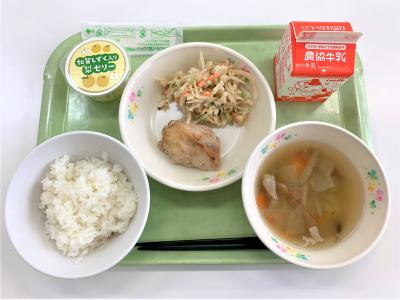 おもてなしのための、ご馳走は、山や田でとれた、さといも、きのこ、たいこん、にんじん、豆などと使って料理します。魚は本来尾頭付きを使いますが、給食では、地元のふくらぎを使いました。