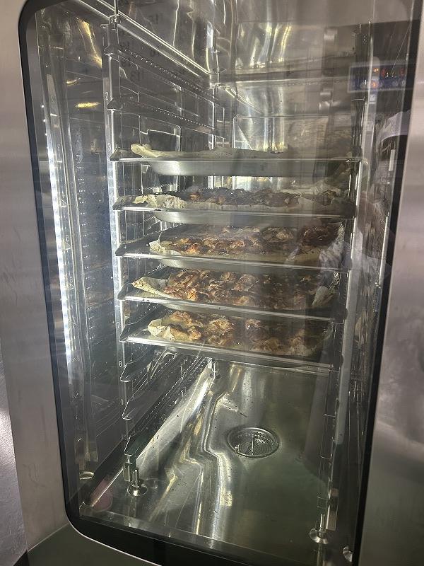 鶏肉の照り焼きは、朝届いたお肉に調味料を漬け込み、調理場で焼いて作ります。調理員さんはお肉が焦げないように、温度調整や水分調整をこまめにしながら作ってくれました。香ばしい香りが食欲をそそります。