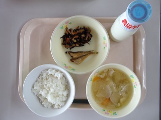 おもてなしのための、ご馳走は、山や田でとれた、さといも、きのこ、たいこん、にんじん、豆などと使って料理します。魚は本来尾頭付きを使いますが、給食では、地元のふくらぎを使いました。