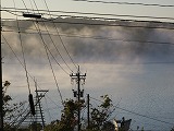 ※気嵐は、海上に発生し、まるで海が湯気を出しているかのように蒸気が海面から立ち上る様子である。気嵐は放射冷却によって冷え込んだ日の早朝に、海水の温度が大気の温度より高く、かつ温度差が15度以上ある場合、海面から蒸発した水蒸気が大気に急激に冷却されることで発生する、蒸気霧の一種である。