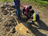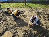 砂場では、自然にできた水たまりを湖に見立て運河を作っていました。また、家やトンネル、橋などどんどんとイメージが広がっていきます。本当に楽しそうです。このような遊びは、いつの世も大切ですね。