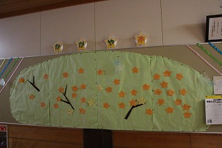 2階廊下の掲示板かがや木が今、ぐんぐん成長中です。