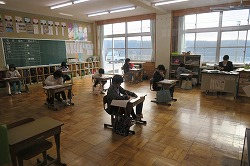 1・2年生は、国・数の2教科。3~6年生は、(今日)国・算 (明日)理・社の4教科です。