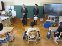 穴水ライオンズクラブ様から1年生に赤青鉛筆をいただきました。赤青鉛筆は信号機の色になぞられており、交通安全に気をつけて、元気に登下校してほしいとの願いが込められています。