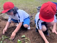 1・2年生の生活科では、花の種や野菜の苗を植えて成長を観察しています。今年は、子ども達が「野菜の名人さん」と呼んでいる大隅さんから教えていただいています。