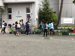 1年生のあさがおや5年生の理科のインゲン、6年生のじゃがいもと並んで、畑の他にも玄関前のプランターでも植えています。毎朝、子ども達は学年関係なく、それぞれの植物の生長を楽しみにしています。