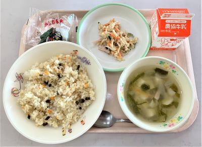 山菜チャーハン(地元産わらび・たけのこ使用)、中華スープ、切干大根のごまマヨサラダ、牛乳、かしわ餅