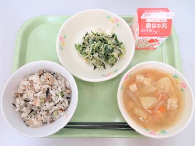 ごはん、ちくわのチーズ揚げ、切干大根のピリ辛炒め、みそけんちん汁、牛乳