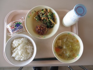 ごはん 魚の蒲焼き おひたし さつま汁 牛乳