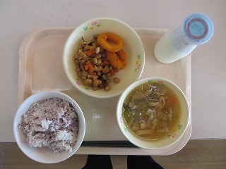 ごはん さつまいもと大豆のごまがらめ しらすあえ みそ汁 牛乳