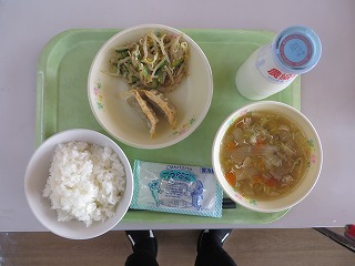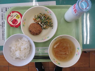 ごはん メンチカツ ごまあえ 五目スープ ゼリー 牛乳