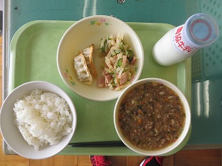 おもてなしのための、ご馳走は、山や田でとれた、さといも、きのこ、たいこん、にんじん、豆などと使って料理します。魚は本来尾頭付きを使いますが、給食では、地元のふくらぎを使いました。