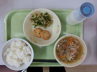 ごはん 五色揚げ きゅうりのピリ辛あえ すきやき風煮 牛乳