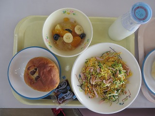 豆パン 冷やし中華 フルーツのゼリーよせ 牛乳