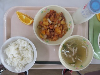 ごはん 酢豚 中華スープ オレンジ 牛乳