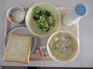 胚芽パン キノコシチュー カップエッグ サラダ ジャム 牛乳