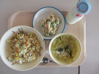 牛肉チャーハン 中華スープ イカくんサラダ 牛乳
