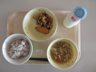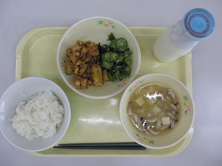 ごはん さつまいもと大豆のごま揚げ しらすあえ みそ汁 牛乳