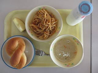 米粉パン スパゲティミートソース コーンスープ りんご 牛乳