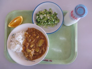 カレーライス サラダ オレンジ 牛乳