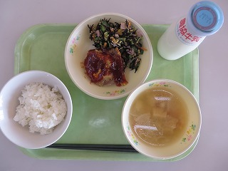 ごはん 鶏肉のバーベキューソース ごま酢あえ のっぺい汁 牛乳