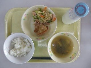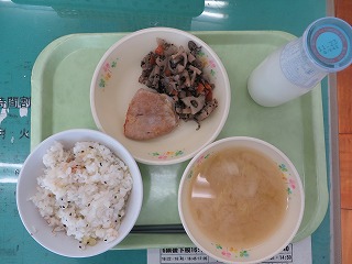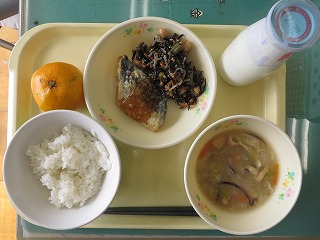 ごはん さわらの唐揚げ ひじきの煮物 みそ汁 みかん 牛乳