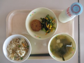炊き込みごはん みそ汁 メンチカツ わかめサラダ 牛乳