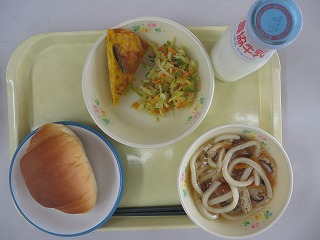 バターロール うどん アンサンブルエッグ カレーソテー 牛乳