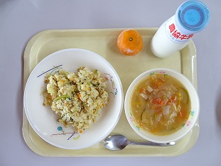 ごはん、焼きギョウザ、ゴーヤチャンプルー、とりとごぼうのすまし汁、牛乳