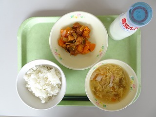 ごはん、豆腐のカレー煮、ひじきのマリネ、牛乳