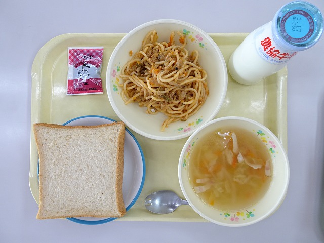 はいが食パン、ミートソーススパゲティ、コンソメスープ、チョコクリーム、牛乳