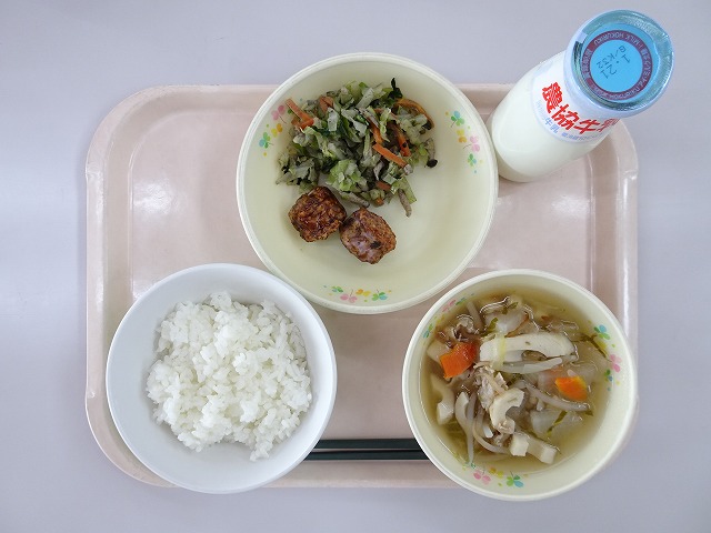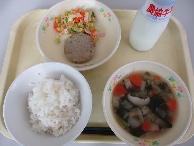 ごはん、竹輪の磯辺揚げ、五目なます、とり野菜、牛乳