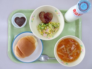 バターロール、ハンバーグ、サラダ、ミネストローネ、チョコプリン、牛乳