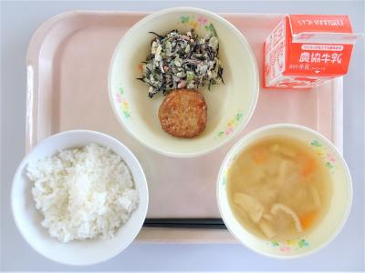 ごはん、鶏と野菜のつくね、ひじきサラダ、みそ汁、牛乳