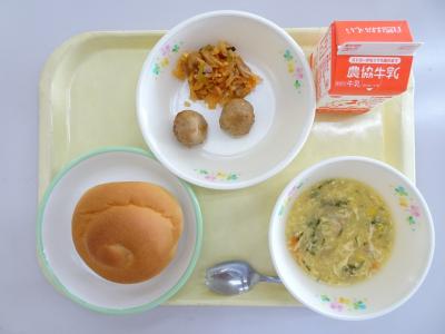 ミルクロール、照り焼きミートボール、切干のアラビアータ風、華風コーンスープ、牛乳